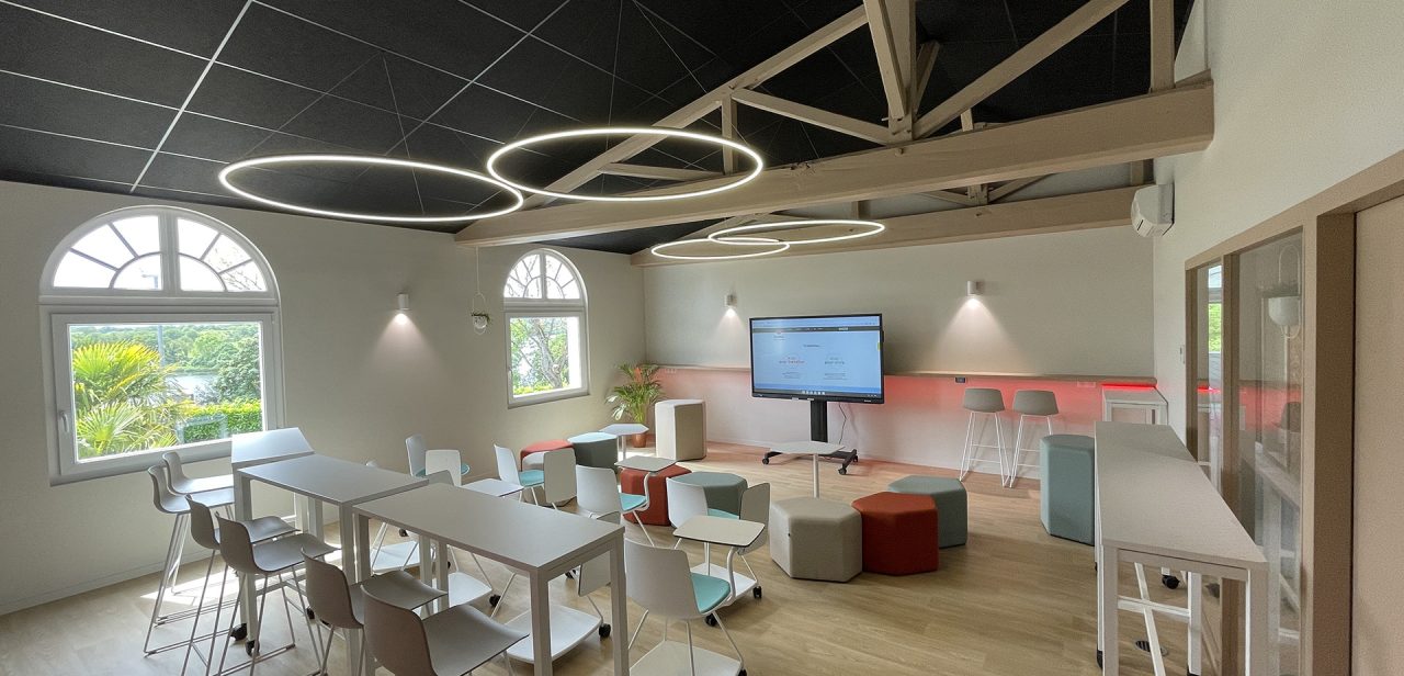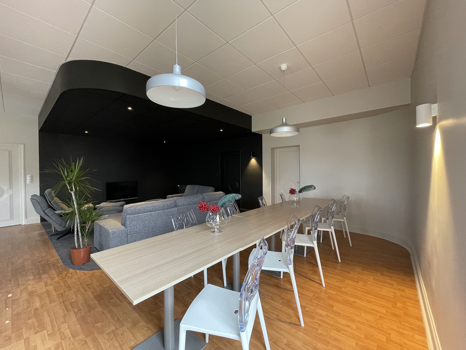 - Une salle moderne de 50 m2 à usage professionnel est équipée d’un écran tactile de 75 et de mobilier sur roulettes facile à déplacer et connectée à la fibre.